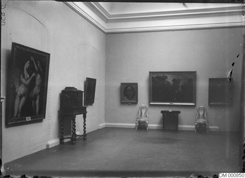 - Bild som visar Malmö museum. Interiör salen för äldre konst 1923. Tavlor, stolar och ett bord.
