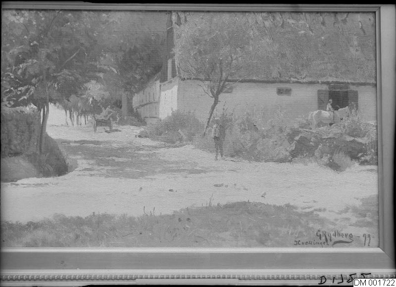 byggnader, tavla, 1899, gustav rydberg, man, män, gårdar, målning, tavlor, 1880-talet, 1900-talet, häst, hästar, torp, målningar, hus, byggnad, gård