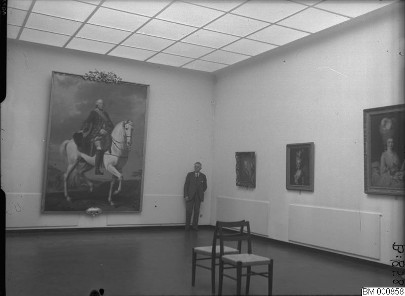 Inomhusbild som visar Malmö museum tillfällig utställning Roslin. Tavlor och stolar i ett rum. En man står vid väggen.