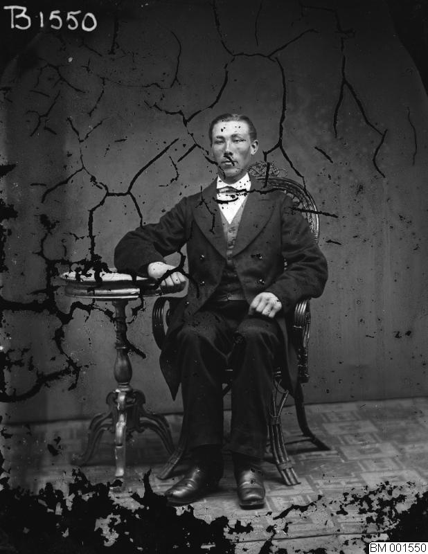 Plåtsamling från Ängelholmsfotograf. Porträtt. Sittande herrar. Helfigur. Man i kostym.