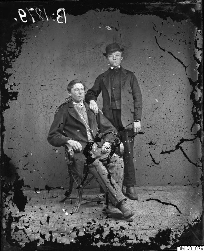 Plåtsamling från Ängelholmsfotograf. Gruppbilder och andra. Två män i kostym, en sitter och en står. Helfigur.