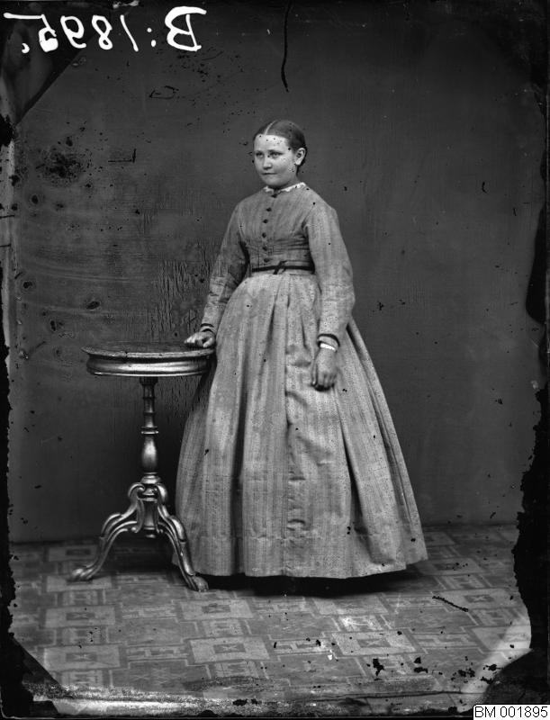 Plåtsamling från Ängelholmsfotograf. Kvinnoporträtt. Stående kvinna. Klädd i klänning.