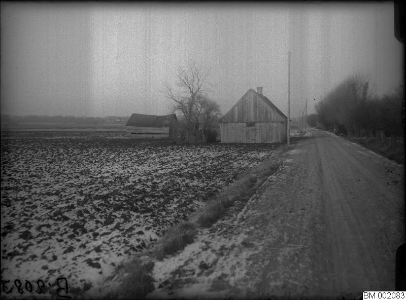 Bild som visar Malmö. Beckrevie vägen. Byggnader och åkrar på vintern.