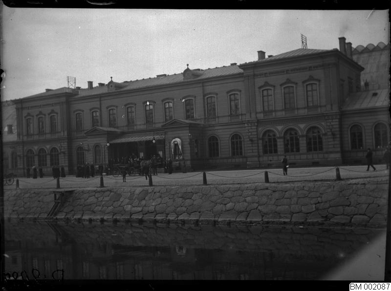 Bild som visar Malmö. Centralstationen. Från andra sidan kanalen. Män, kvinnor och barn vid stationen. En häst och vagn.