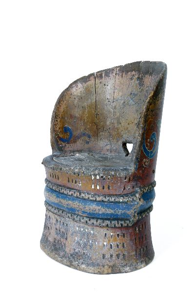 Kubbstol av furu målad i brunröd och blått med målad och skuren ornering.