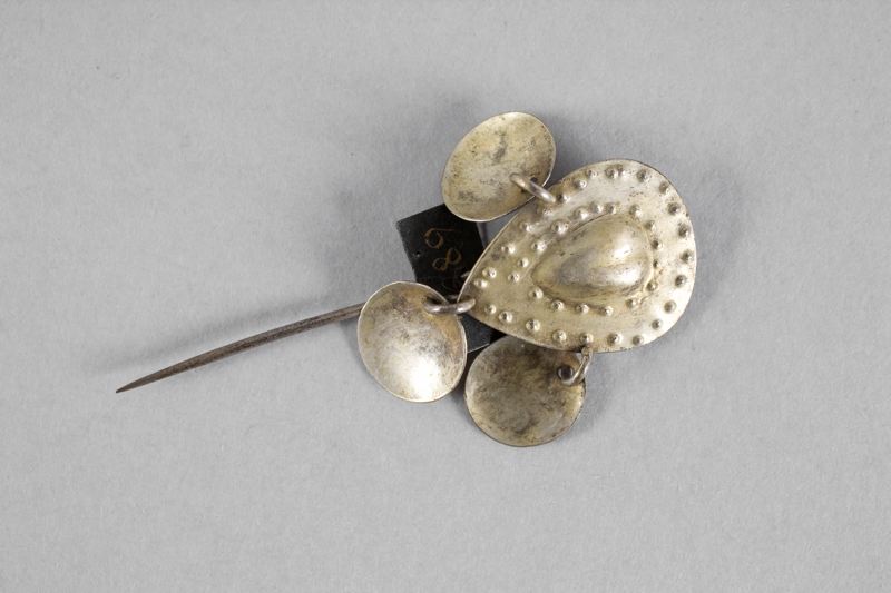 Silverplåt, pressad, förgylld, med tre nedhängande runda blad.