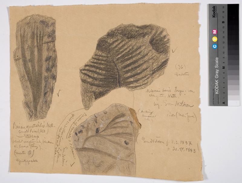 - Kritteckning av av Olof Gylling. Motiv., teckningar av fossil, en ormbunke. och två barrväter. Den förstnämnda, ormbunken Nilssonia brevis. Barrväxten tillhör Ginkgoales Släkte: Baiera