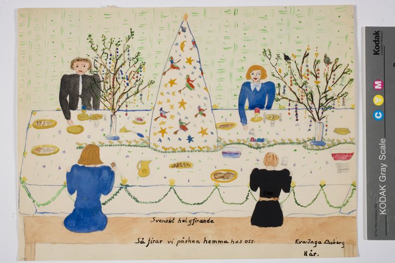 Teckningen är en av de barnteckningar som deltagit i Folket i Bilds teckningstävlan 1944 och som sedan ställdes ut på Malmö Museer. Folket i Bild arrangerade varje år fr.o.m. 1938 och minst 20 år framåt, en teckningstävlan för skolbarn varje år med olika teman.1944 års tema var "Svenskt helgfirande". Urvalet gick till så att läraren för varje klass som deltog gjorde en grovsortering av det erhållna tävlingsmaterialet och sände in dessa till en speciell jury. Efter jurygranskning blev det utställning av de utvalda sakerna på Nationalmuseum och sedan vandrat runt på olika museer i Sverige.