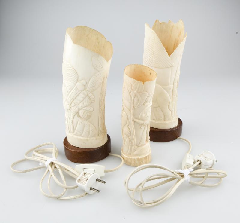 Lampor av bearbetat elfenben, 2 med sockel och sladd.
