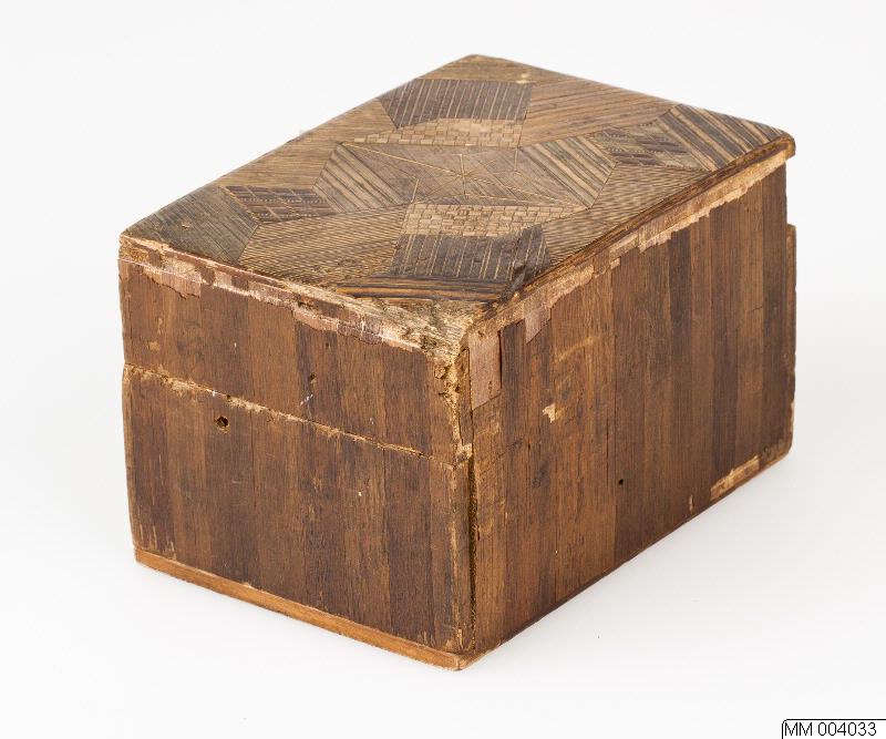 Ask av trä med fanér av halmintarsia. En större och en mindre låda. Märkt i botten med ett märke med danska