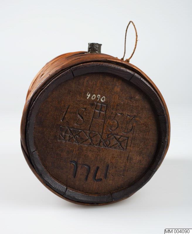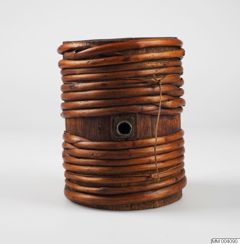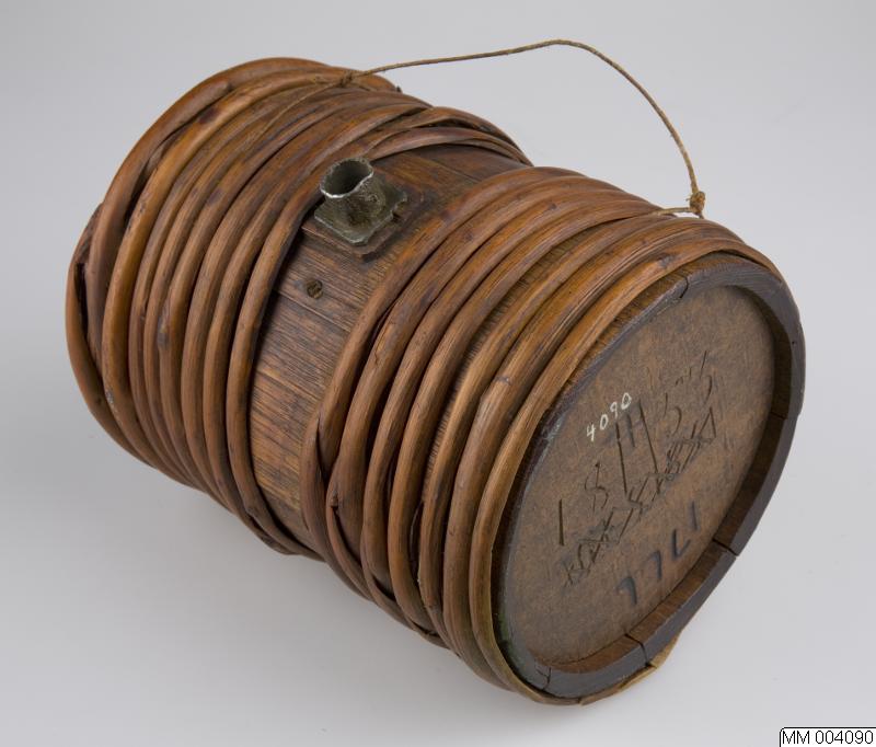 Laggkärl, läjel av ek. Cylindrisk, bandad på mitten ett kort rör av tenn. I
