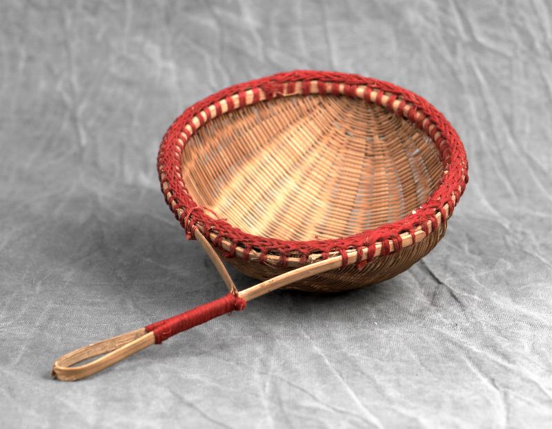 Flätad av bast, med handtag. Röd sydd rand längs kanten.