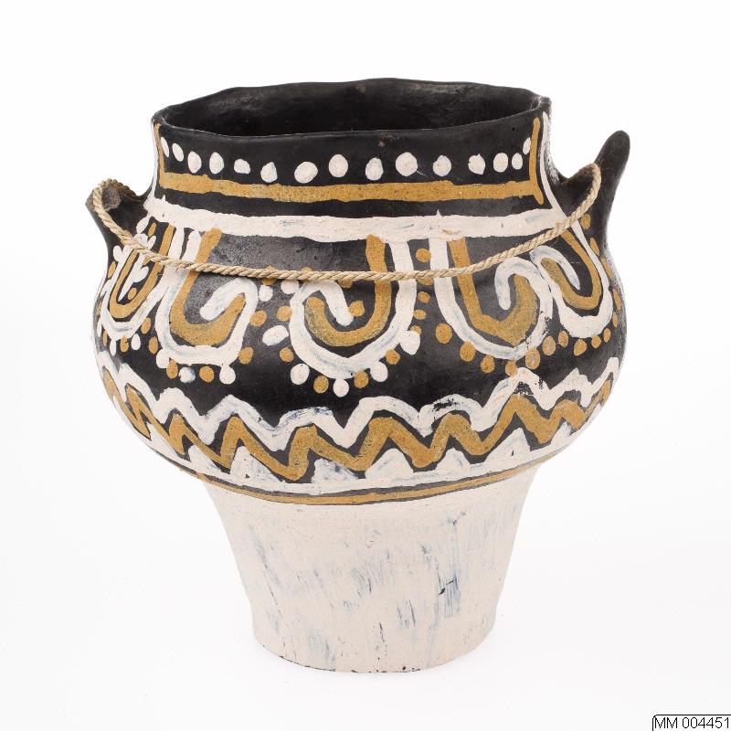 Halsband av sten- och glaspärlor. De rödgula runda pärlorna är av agat