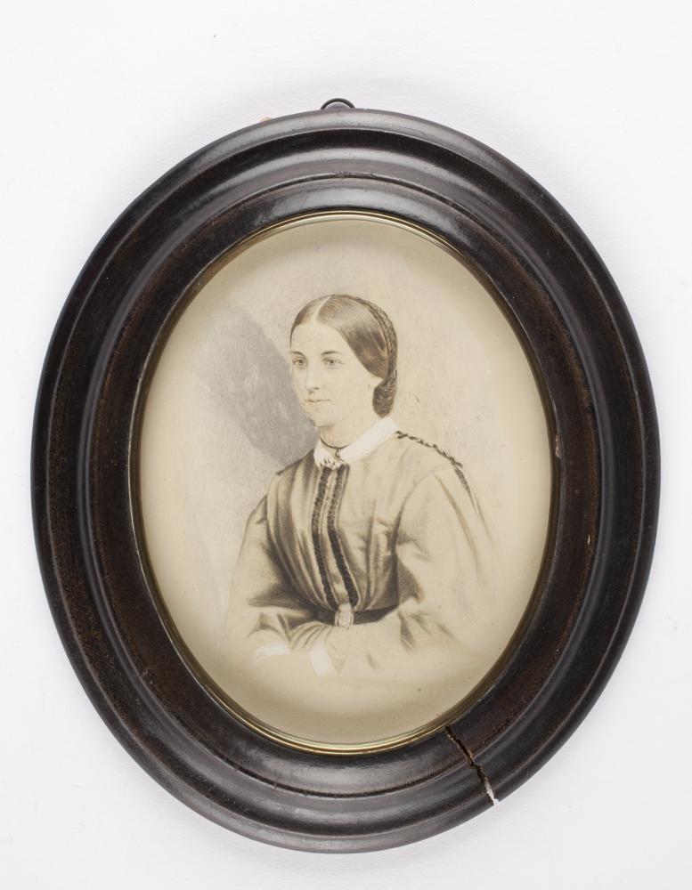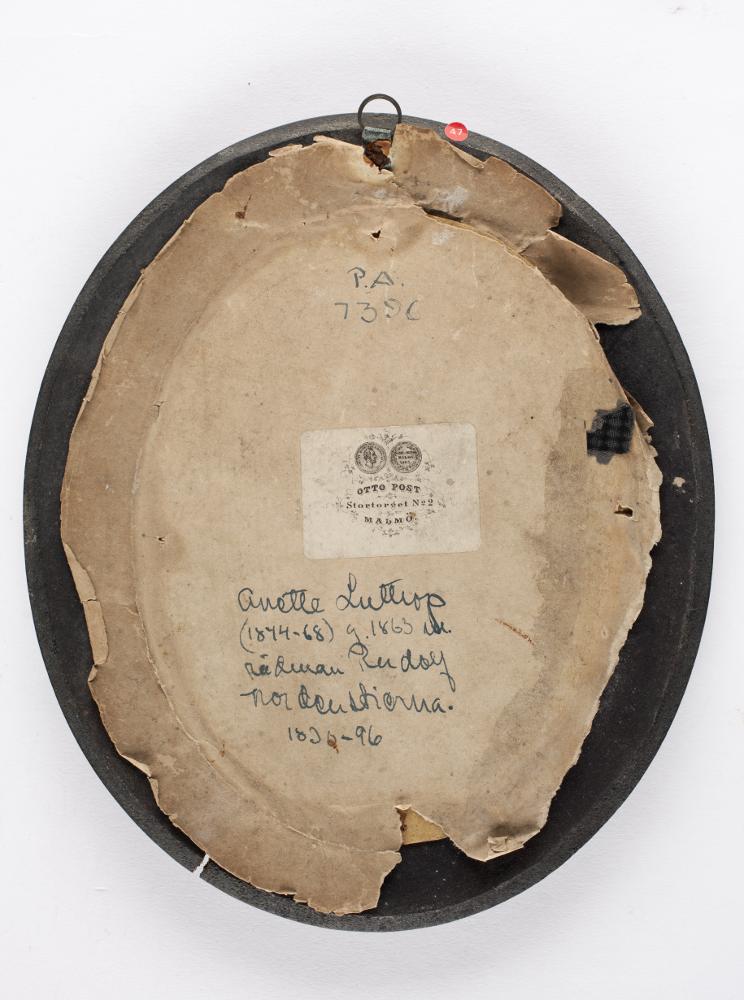 Porträtt av Anette Lutropp. Retuscherat fotografi, monterad i oval, svart träram.