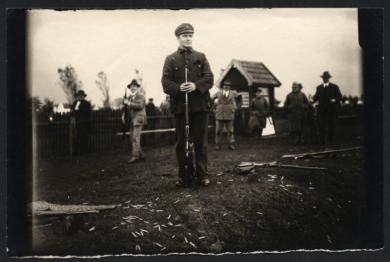 Okänt årtal. Män med gevär och patronhylsor på marken.