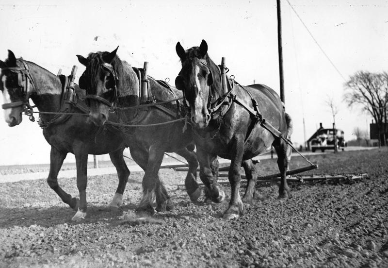 Vårbruket i Skåne i full gång. Tre goda arbetskamrater framför harven. Från Söderslätt vid Västra Klagstorp.