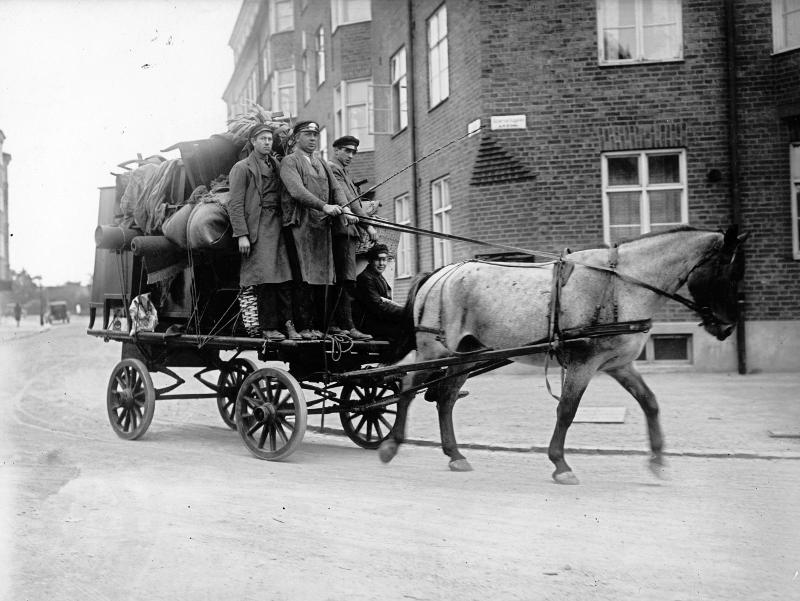 ROO 004634 :: flyttlass, bohag, flakvagn, häst, flyttkarl, flyttning, man, värnhemsgatan, män