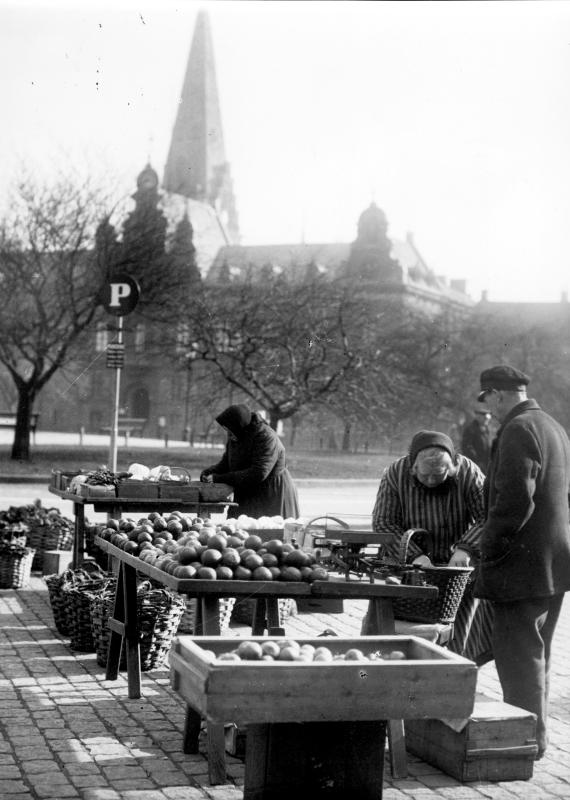 ROO 004882 :: kvinna, kvinnor, torg, kund, torghandel, stortorget, man, torgstånd, män, fruktförsäljning