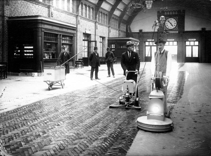 ROO 004890 :: järnvägsstation, städning, ombyggnad, städmaskin, man, män, malmö centralstation