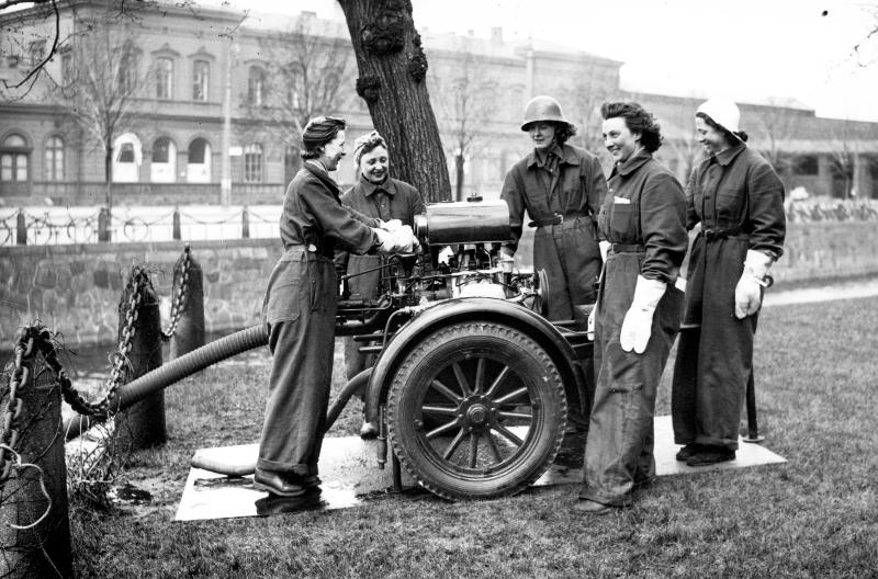 övning, kvinna, kvinnor, brandkår, brandspruta, luftskydd, brandsoldat, telefonist, telegrafverket