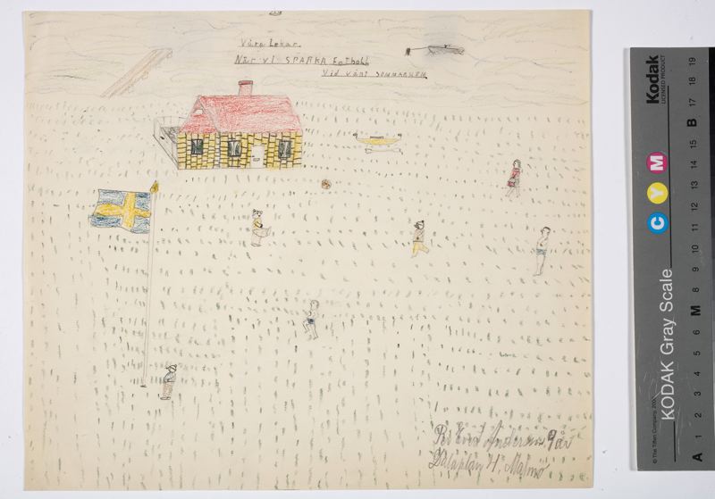 Skrivet med blyerts på framsidan: Våra lekar / När vi sparka fotboll / vid vårt sommarhem / Per Evert Andersson, 9 år / Dalaplan 4, Malmö