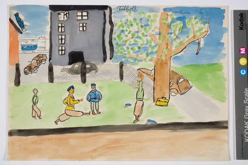 Teckningen är en av de barnteckningar som deltagit i Folket i Bilds teckningstävlan 1945 och som sedan ställdes ut på Malmö Museer. Folket i Bild arrangerade varje år fr.o.m. 1938 och minst 20 år framåt, en teckningstävlan för skolbarn varje år med olika teman.1945 års tema var "Våra lekar". Urvalet gick till så att läraren för varje klass som deltog gjorde en grovsortering av det erhållna tävlingsmaterialet och sände in dessa till en speciell jury. Efter jurygranskning blev det utställning av de utvalda sakerna på Nationalmuseum och sedan vandrat runt på olika museer i Sverige.