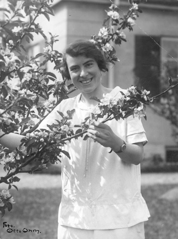 ROO 005013 :: fruktträd, kvinna, kvinnor, blommor, trädgård, blomning, blomma