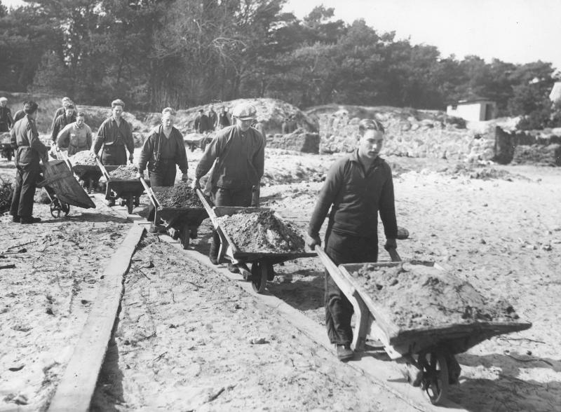 falsterbo; man; utgrävning; falsterbohus; värnpliktig; skottkärra; män