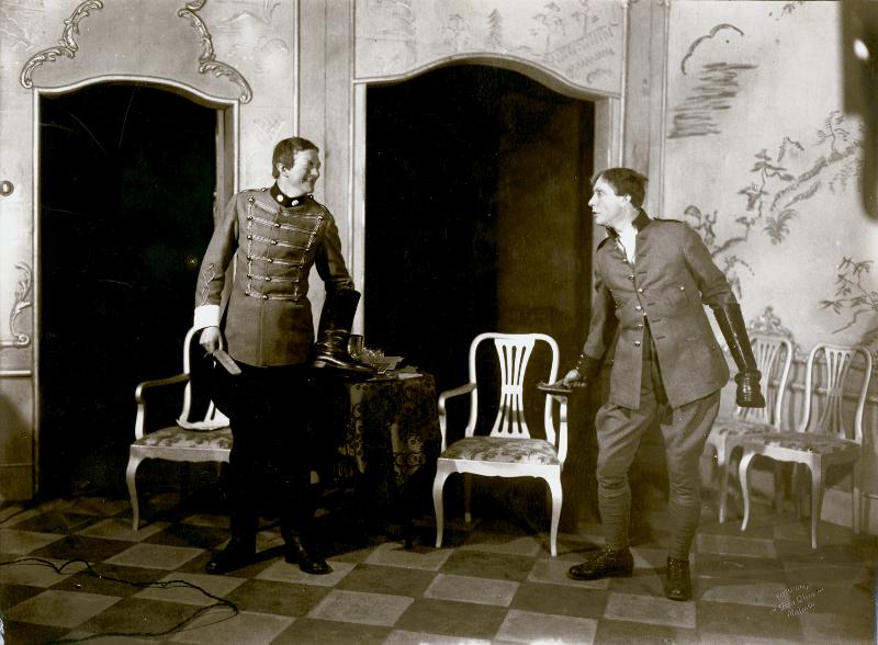 Teater: Två män (soldater) putsar sina stövlar. (Ingrid).