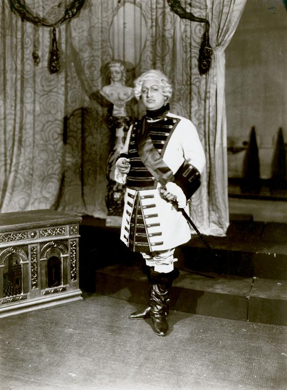 Teater: Porträtt av manlig skådespelare iklädd uniform. (Ingrid).
