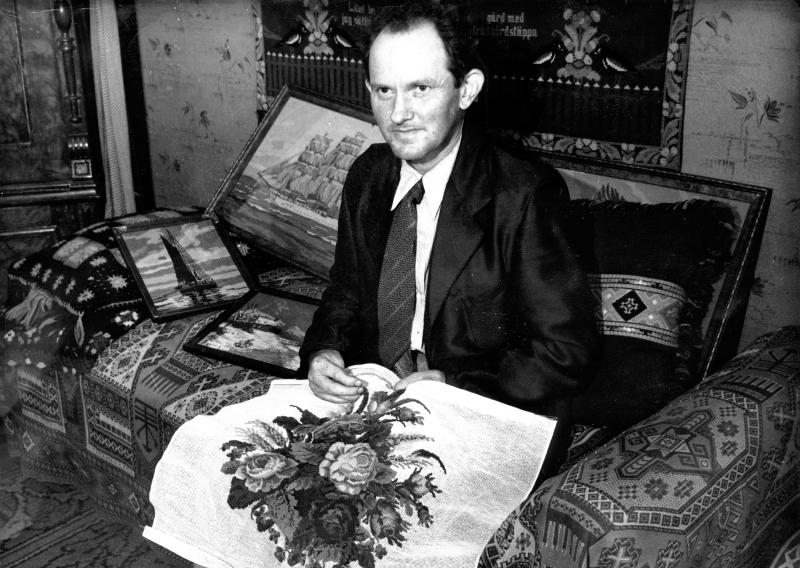 etamin, bärred, man, reumatiker, brodyr, erik jönsson, handarbete, män, porträtt, stramalj