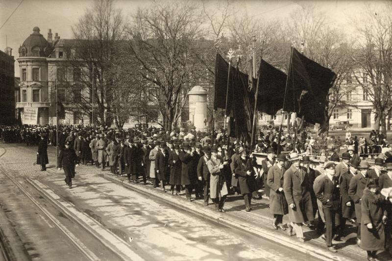ROO 005536 :: maj, demonstrationståg, parader, exteriör, broar, flaggor, folksamling, demontrationer, flagga, demonstration, första, folksamlingar, parad, bro