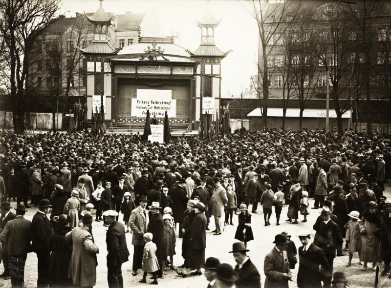 - Demonstranterna inne i Folkets Park som lyssnar på en talare.