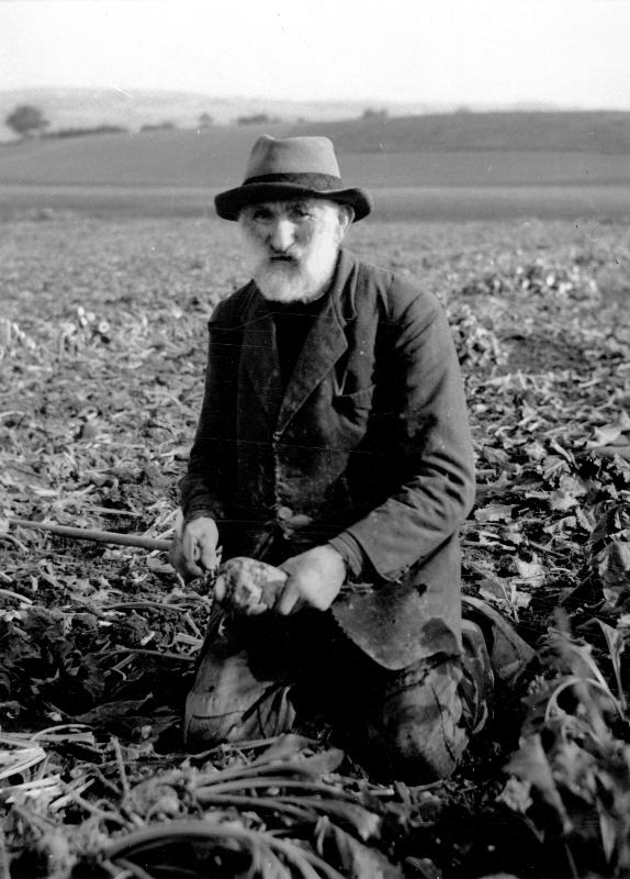 - Okänt årtal. Äldst i betorna. Skomakaren Hans Hansson, Janstorp, Slimminge som ännu vid 83 års ålder hjälper sin svärson med betupptagningen, vilket han hållit på med i 30 år.