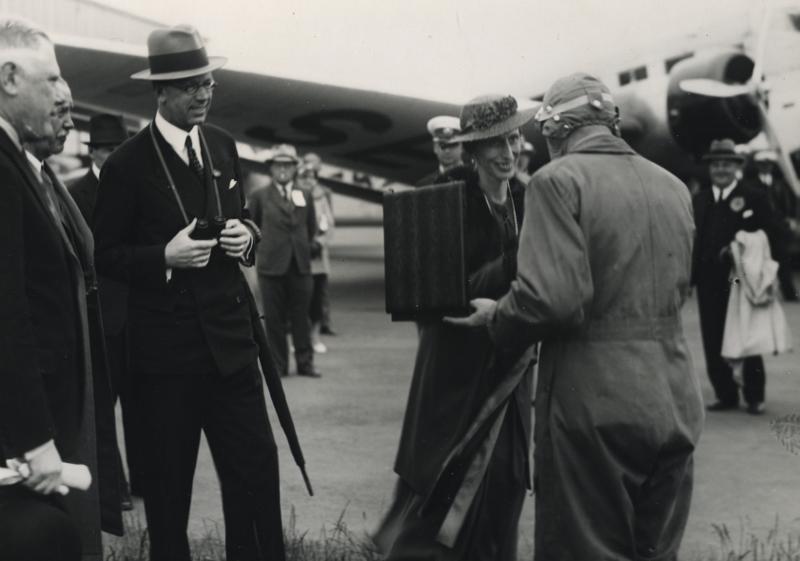 Flygdagen i Malmö. Kronprinsessan överlämnar priset till segraren i ankomsttävlingen löjtnant Hansen.