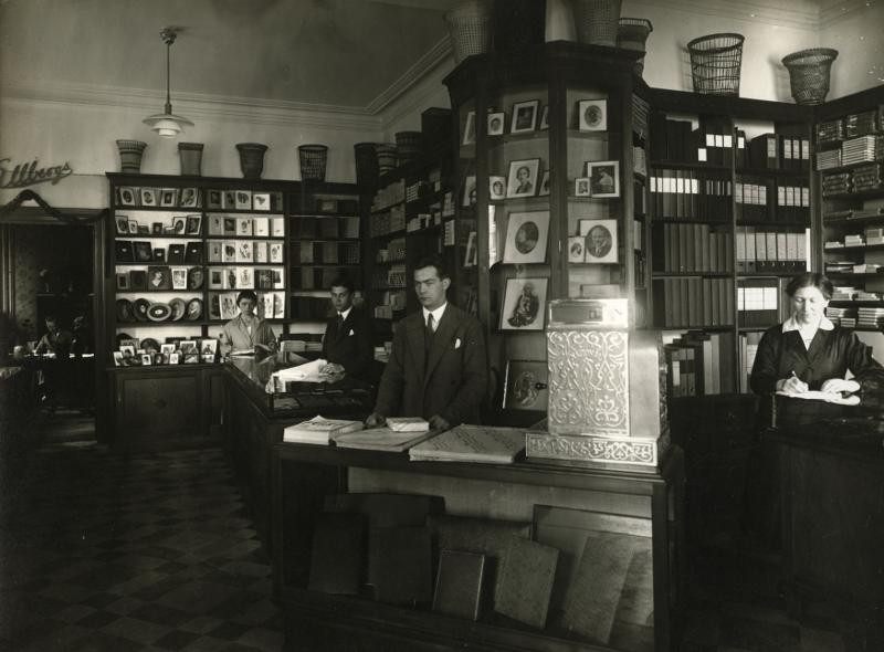 ROO 010701 :: affär, kvinna, pappershandel, kvinnor, expedit, handel, ramar, man, kontorsmaterial, bok, män, affärsbiträde, ram