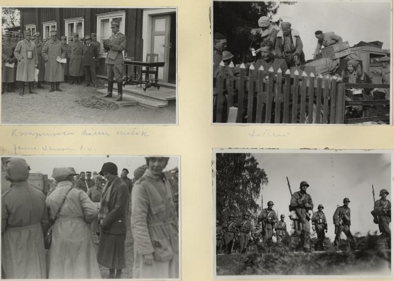 - Skånekriget 1935. Kronprinsen håller kritik, Janne Larsson till vänster. Lottorna. Kronprinsessan hos lottorna. Soldater.