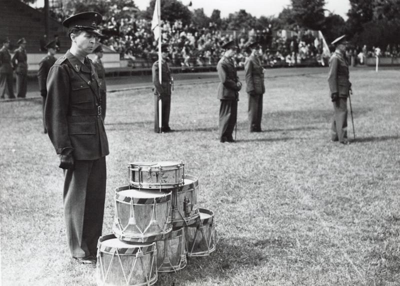 - Unikt militärt skådespel i Malmö kungliga Skånska Luftvärnskåren erhöll på söndagen ett standar från konungen. Bilden visar fältpastor Nivenius förrätta korum.