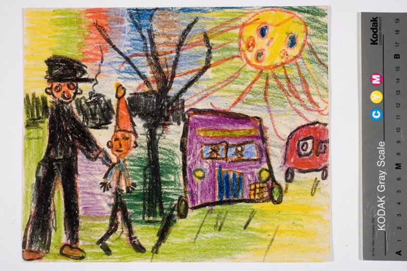 Barnteckning, i krita föreställande ett barn i toppluva på väg att gå ut framför en buss.