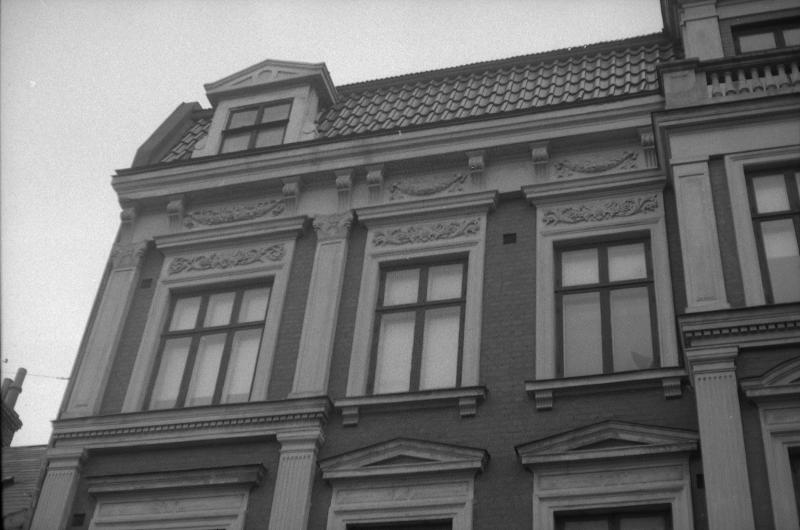 Utomhusbild som visar kvarter 46 Von Conow. Flervåningshus snett nerifrån. Byggnadsdekorationer som festoner och frontoner ovanför några fönster.