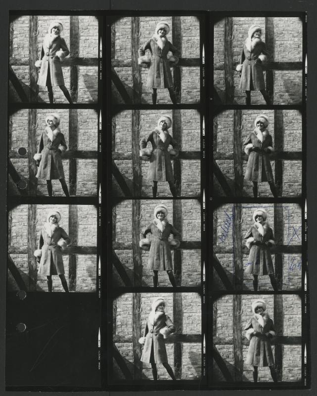 Kontaktkarta. Kvinna i pälsbrämad kappa och pälsmössa. Tagningar för Wigens AB i Tranås.