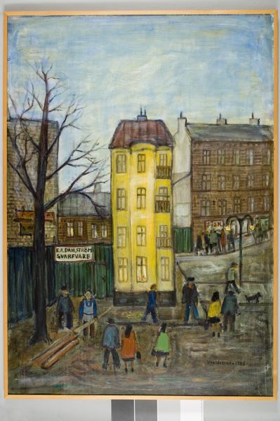 - Motiv från stadsdelen Caroli i Malmö. I bildens centrum syns det s.k. Gula Huset, med adress Baltzarsgatan 11, där svarvare K.A. Dahlström hade sin verkstad. Ett tiotal människor rör sig kring huset och i bakgrunden, intill en fiskaffär, står ytterligare ett tiotal människor i en klunga.
