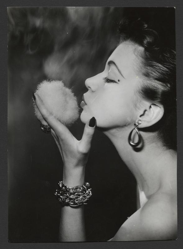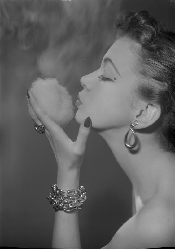 ODR 001574 :: kvinna, kvinnor, inomhus, puderpuff, armband, örhänge, porträtt, puderpuffar