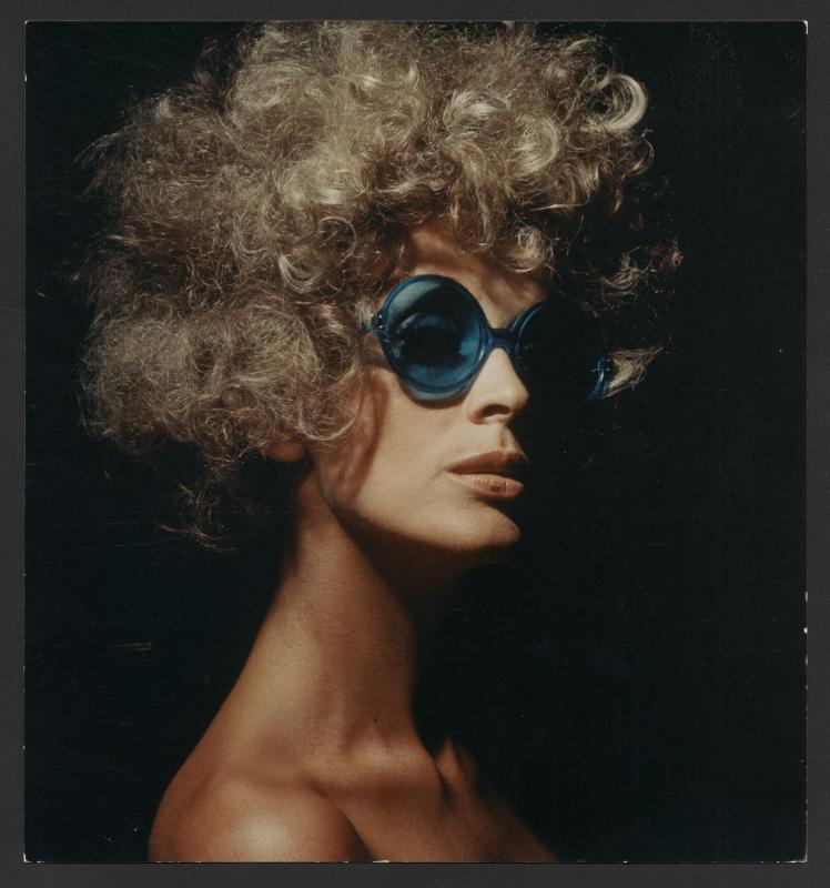 Kvinna i peruk och blåfärgade glasögon