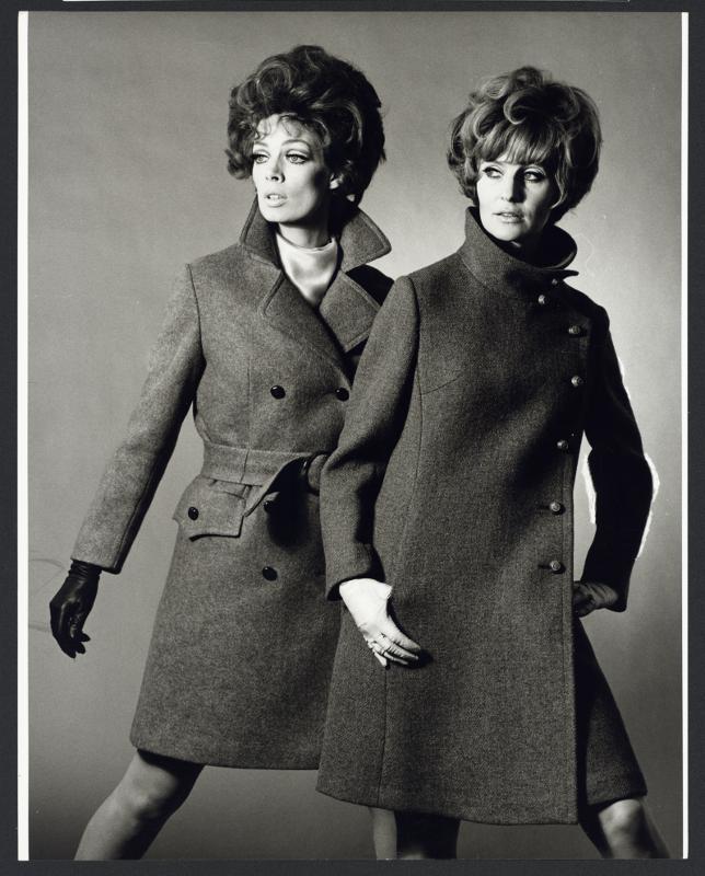 - Svartvit bild, två kvinnor i mörka jackor med höga kragar. Den ena har svarta handskar och den andra har vita handskar. De står med bena brett isär och tittar åt vänster.