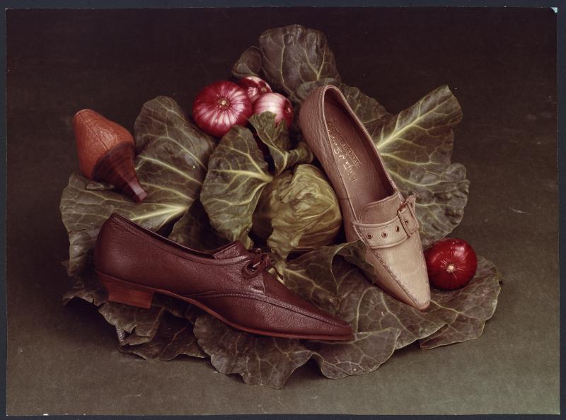 - Färgbild, tre skor och fyra röda lökar ligger på en hög med salladsblad. Bakgrunden är grön.