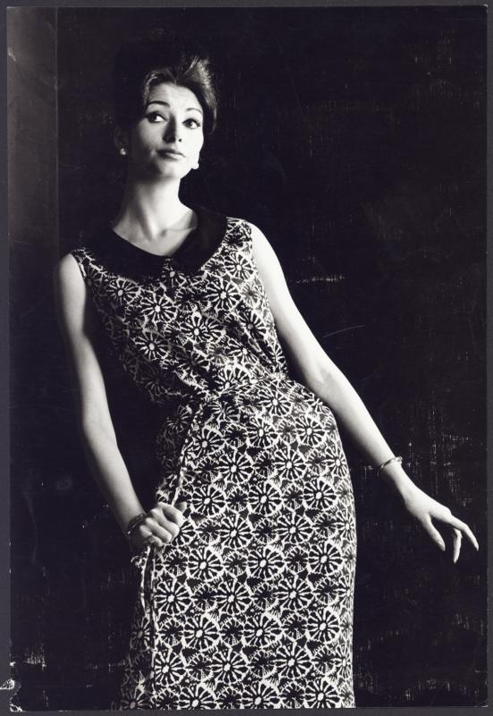 - Svartvit bild, kvinna i svartvit klänning med svart krage. Klänningen har ett skärp som hon drar i med högra handen. Hon lutar lite till vänster, tittar till vänster och vänstra armen är utsträckt.