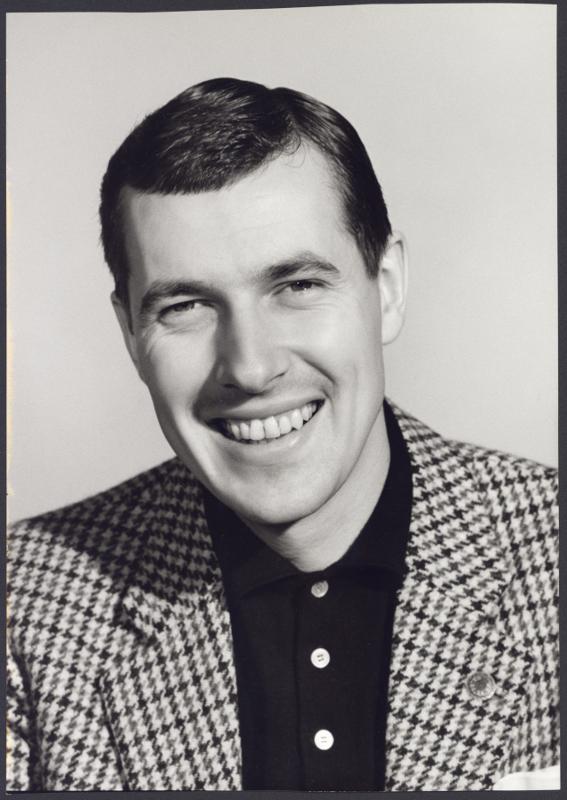 - Svartvit bild, man i svartvit rutig kostym och svart tröja med vita knappar. Bara axlar och huvud syns. Han ler och tittar in i kameran. Mörkt hår.