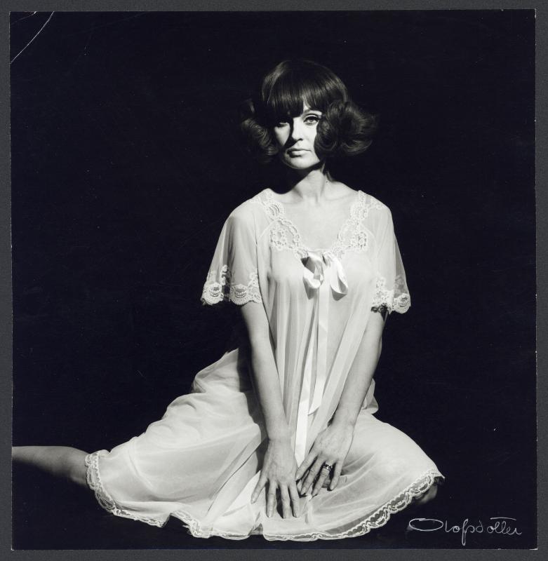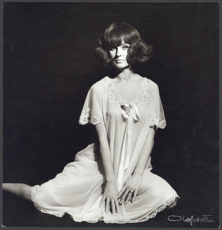 Svartvit bild, kvinna sitter på golvet i ljust, tunnt nattlinne med en rosett i kragen. Svart bakgrund.