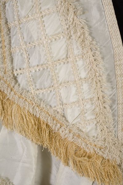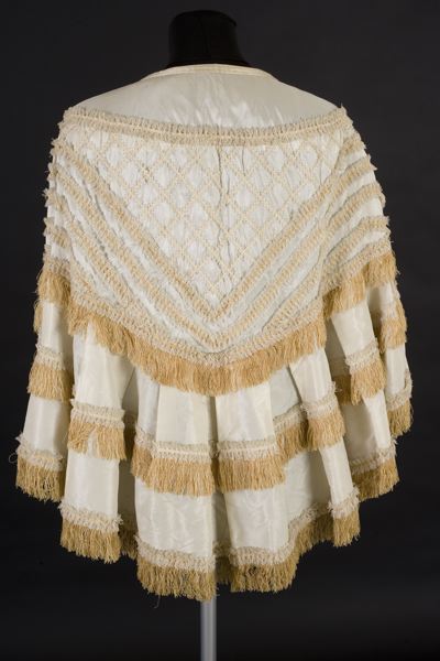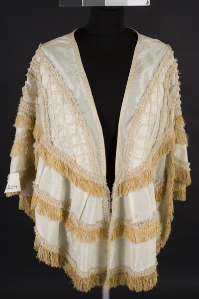 Mantilj av vitt siden, garnerad med (gulnade) vita silkefransar